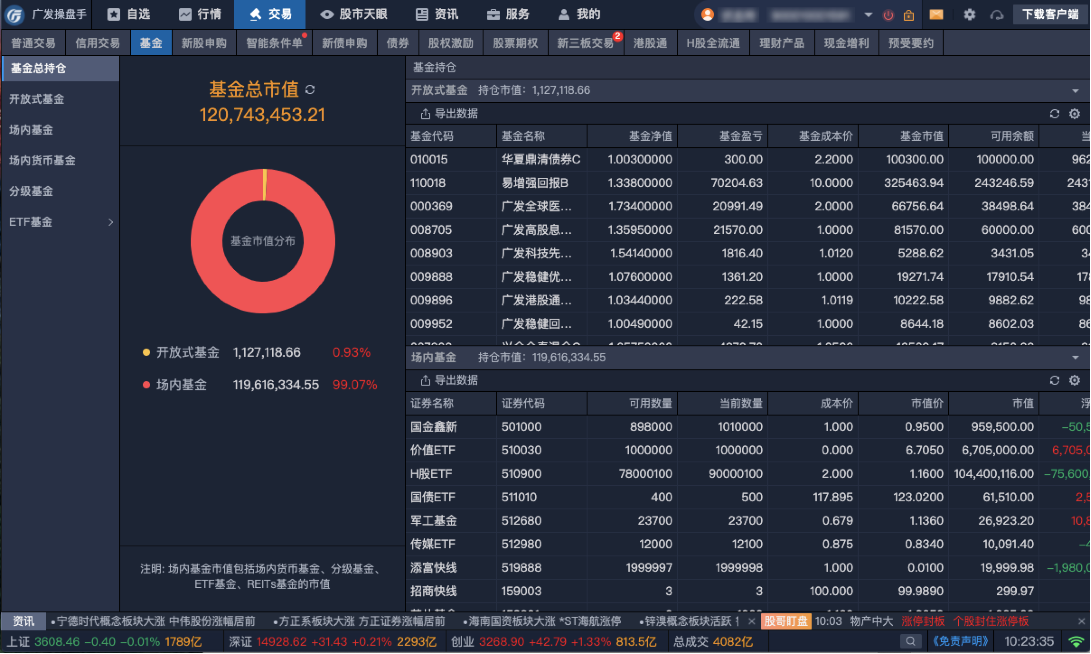 点击菜单【交易】-【基金】-【基金总持仓】,查看基金总持仓信息。