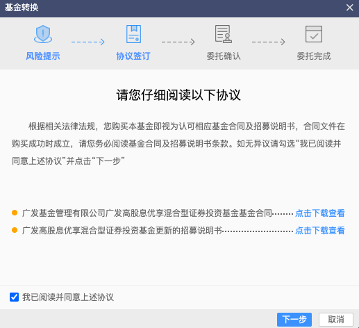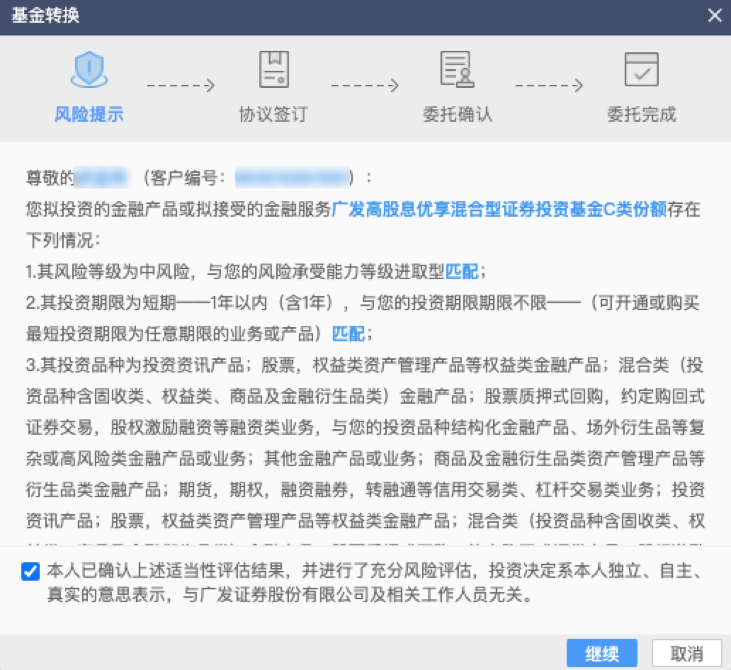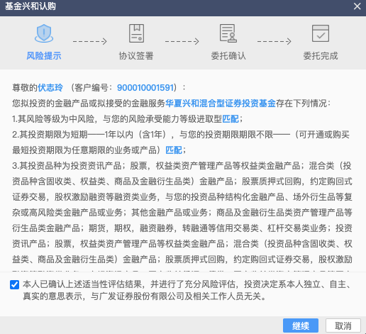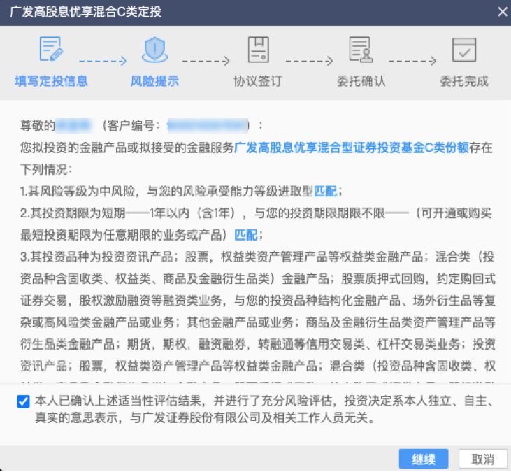 ⑤弹窗出现基金确认窗口,阅读风险提示,如同意风险提示内容勾选底部文字,点击【继续】进入下一步。