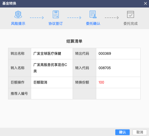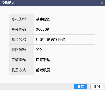 ④在弹出委托确认窗口进行信息确认,委托结果可通过【基金委托】列表查看。