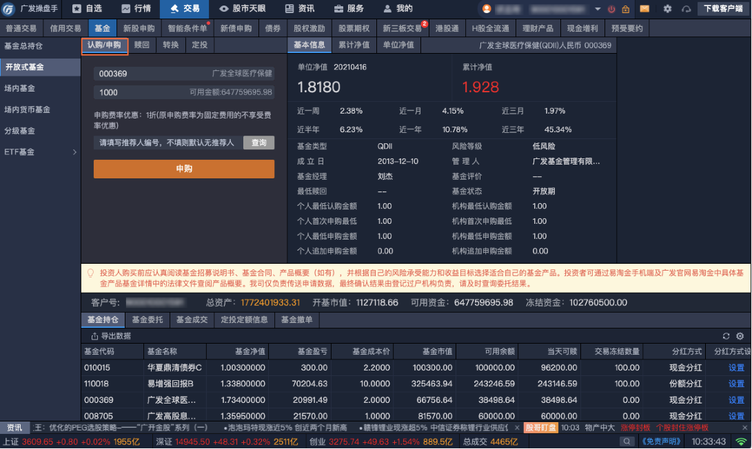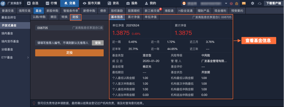 点击【交易】-【基金】-【开放式基金】,切换到【认购/申购】标签,操作流程如下: