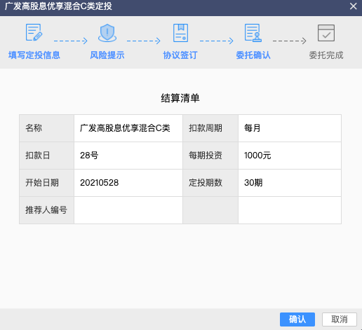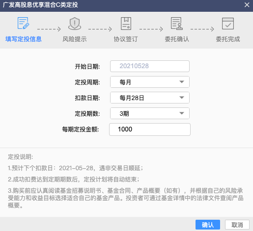 ③弹出窗口,选择定投周期、扣款日期、定投期数、输入每月定投金额,点击【确认】进入下一步。