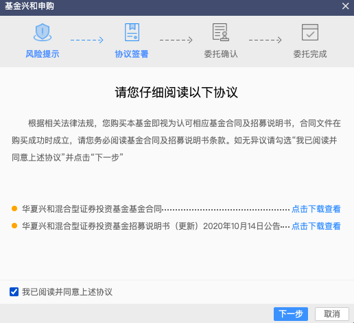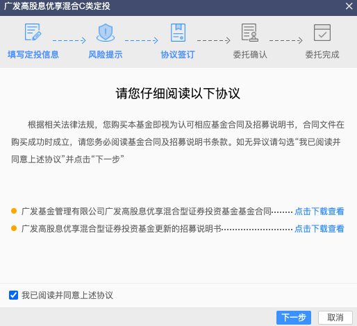 ⑤阅读协议内容,如无异议勾选底部文字"我已阅读并同意上述协议"并点击【下一步】。