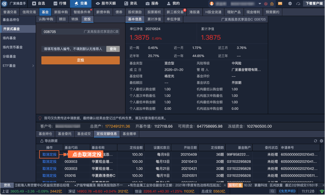 如需取消定投,在【交易】-【开放式基金】的底部切换到【定投定额信息】列表,点击【取消定投】,在弹出的基金定投委托撤单窗口进行确认,即可完成定投取消。