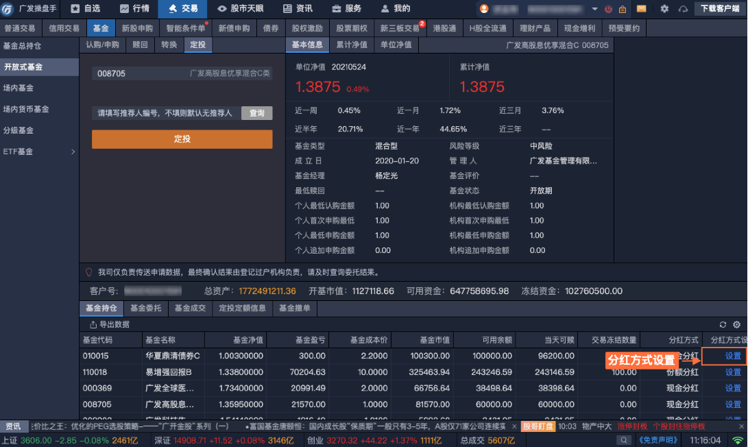 在【交易】-【开放式基金】的底部【基金持仓】列表,点击分红方式设置列【设置】。