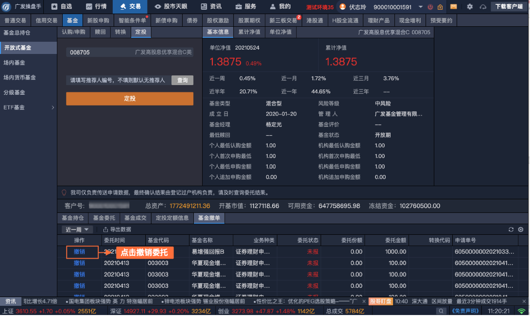 在【交易】-【开放式基金】的底部【基金撤单】列表,点击操作列【撤销】。在弹出的提示窗口进行确认,撤单结果通过委托记录查看。