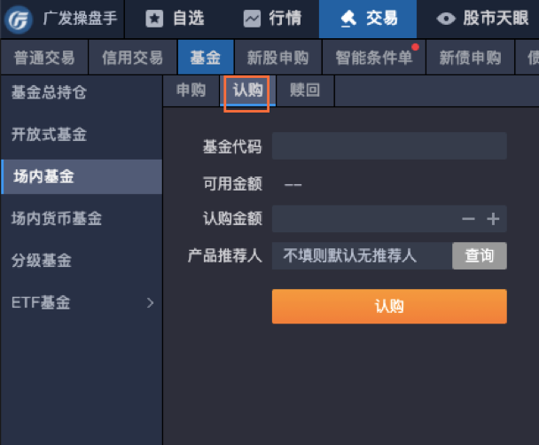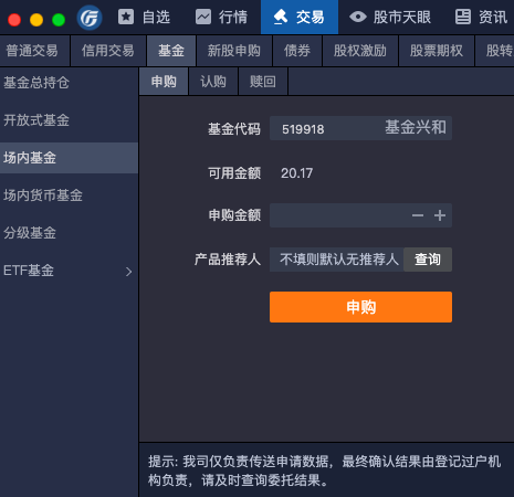 点击菜单【交易】-【基金】-【场内基金】,选择【申购】标签。操作流程如下:
