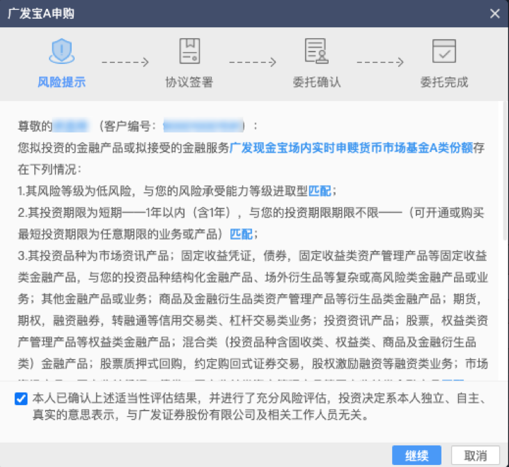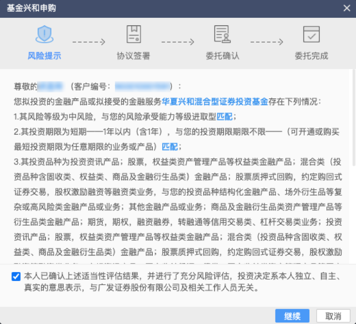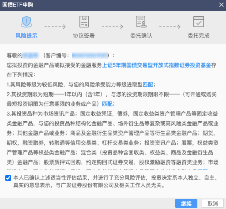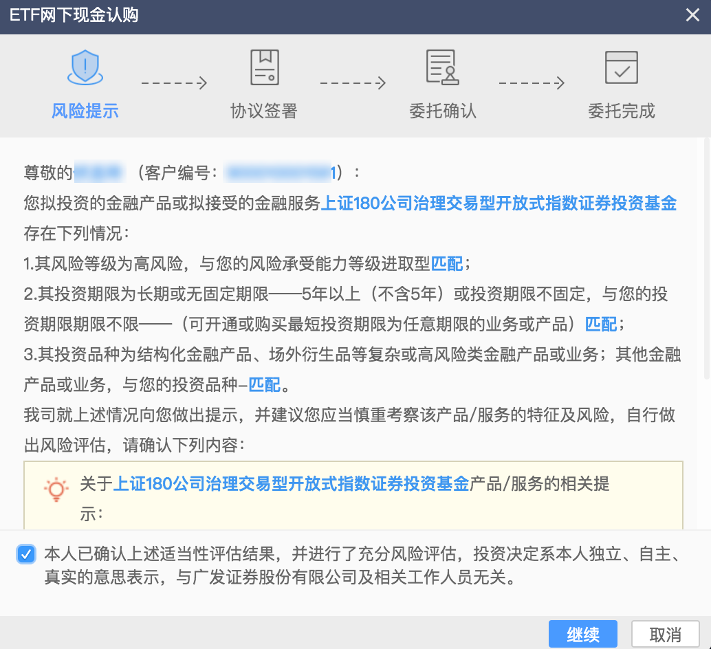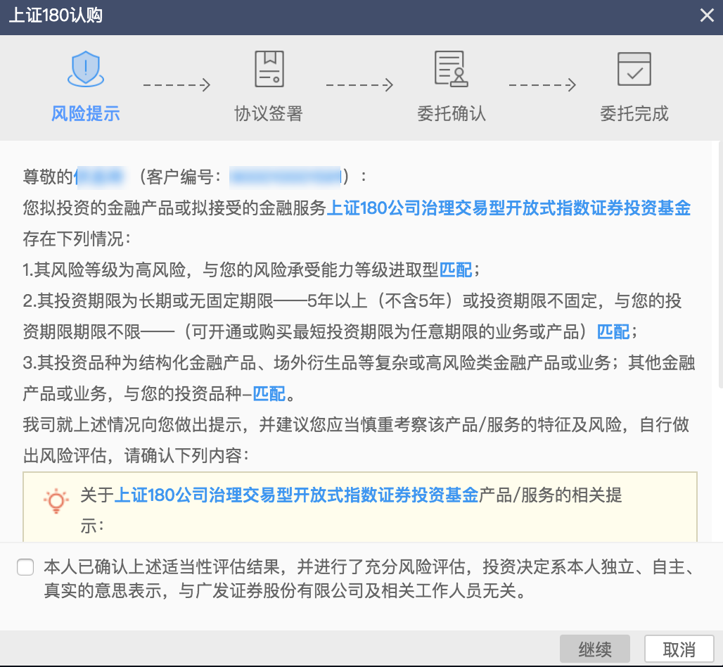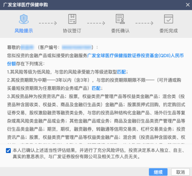 ⑤阅读风险提示,如同意风险提示内容勾选底部文字,点击【继续】进入下一步。