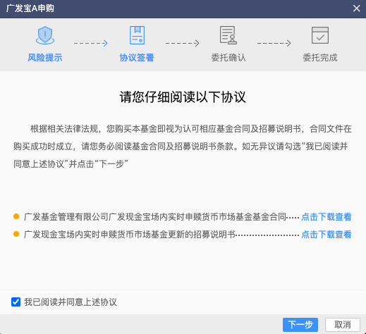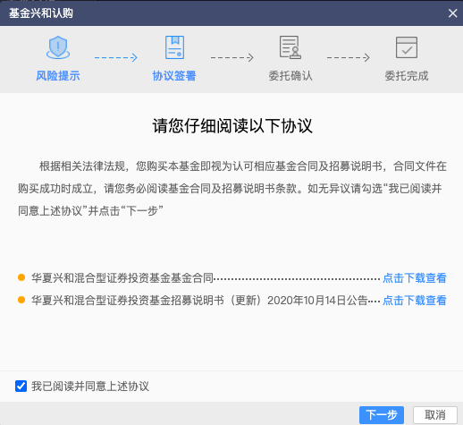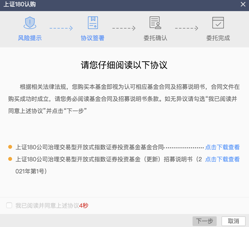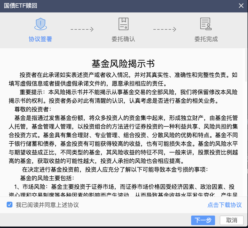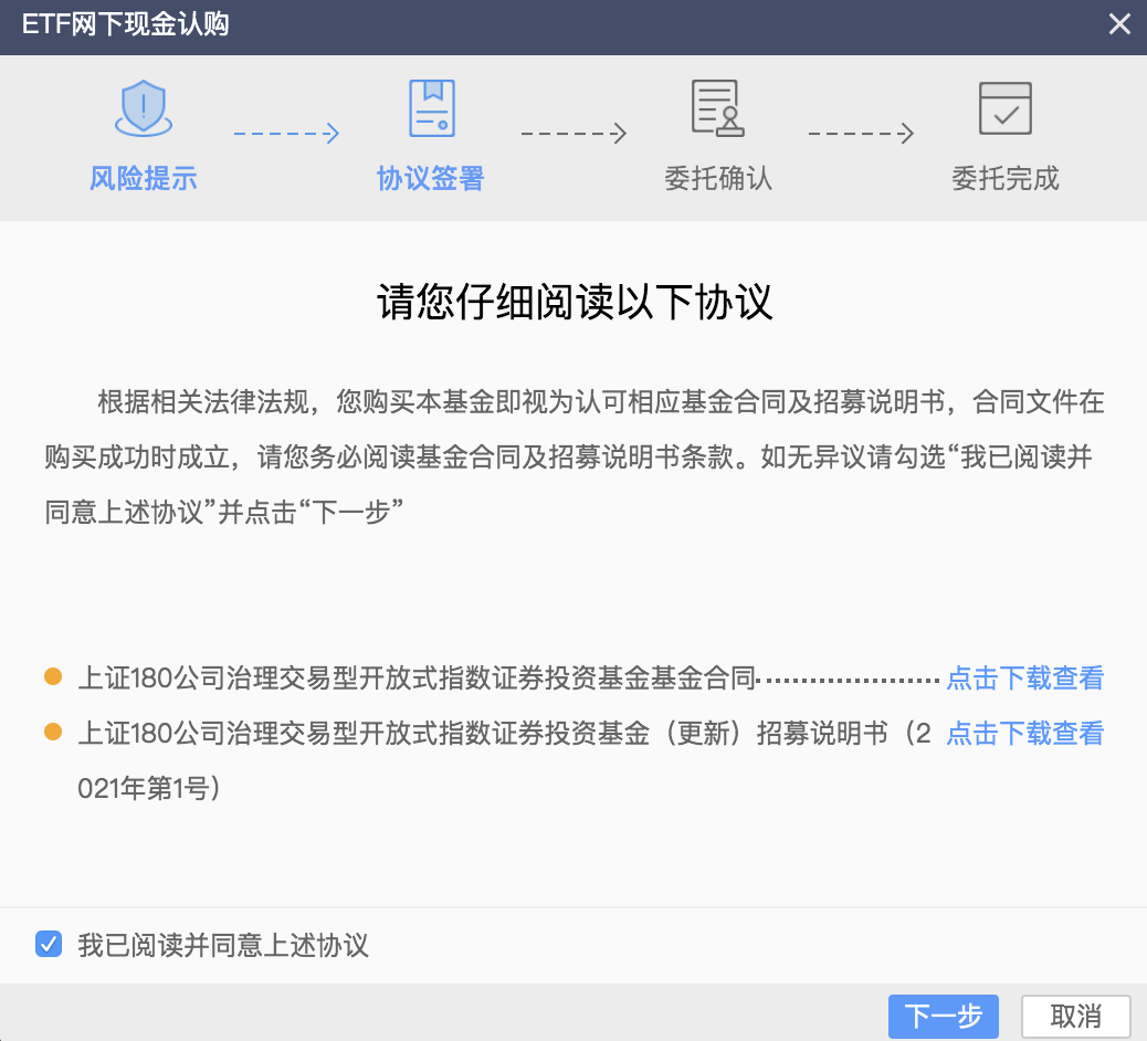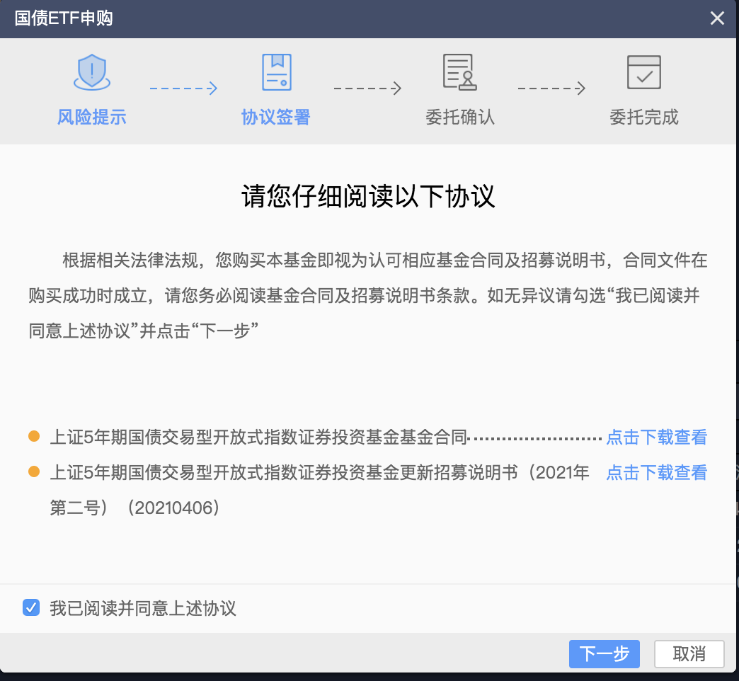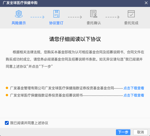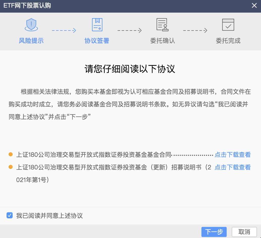 ④阅读协议内容,如无异议勾选底部文字"我已阅读并同意上述协议"并点击【下一步】。