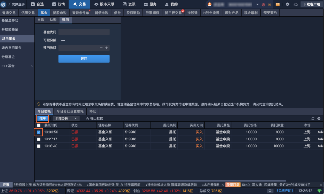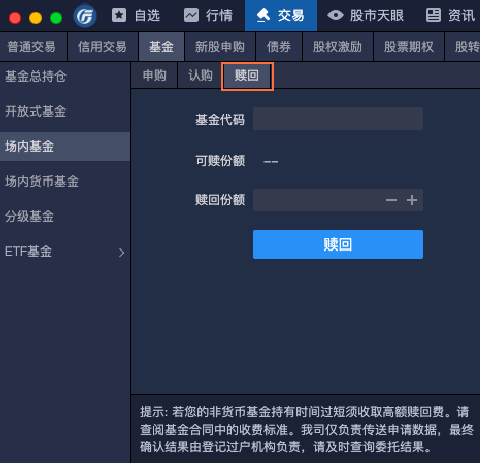 点击菜单【交易】-【基金】-【场内基金】,切换【赎回】标签。操作流程如下: