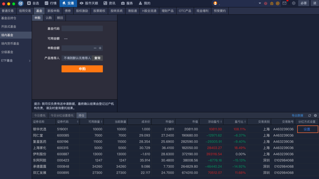 在菜单【交易】-【基金】-【场内基金】底部列表【持仓】,点击分红方式设置字段【设置】,点击设置基金分红方式。