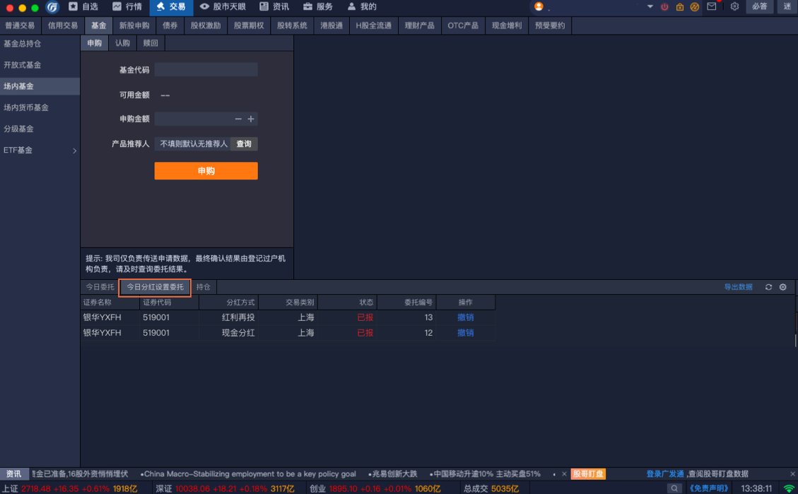 基金分红方式设置提交成功后,通过底部列表【今日分红设置委托】查看结果。