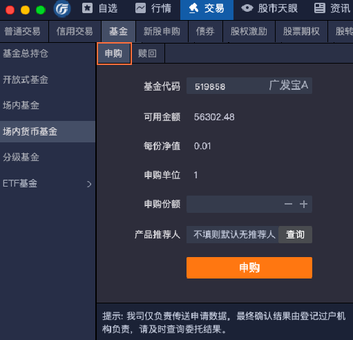 点击菜单【交易】-【基金】-【场内货币基金】,选择【申购】标签。操作流程如下: