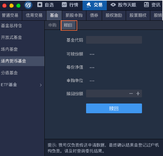点击菜单【交易】-【基金】-【场内货币基金】,切换【赎回】标签。操作流程如下:
