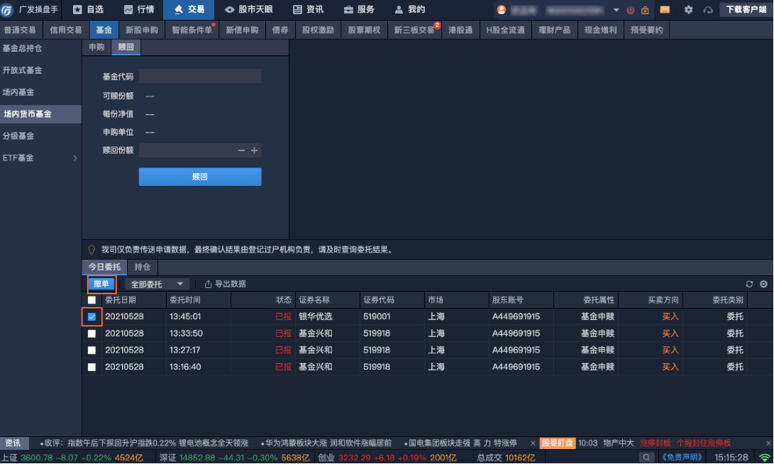 在菜单【交易】-【基金】-【场内货币基金】底部列表【今日委托】,通过勾选框单选或多选需要撤单委托,点击【撤单】按钮。在弹出的提示窗口进行确认,撤单结果通过委托记录查看。
