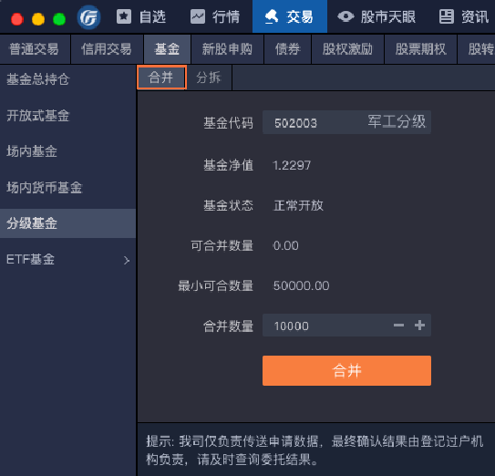 点击菜单【交易】-【基金】-【分级基金】,选择【合并】标签。填写基金代码、合并数量,点击【合并】按钮。在弹出的委托确认窗口进行确认,委托结果通过【今日委托】列表查看。