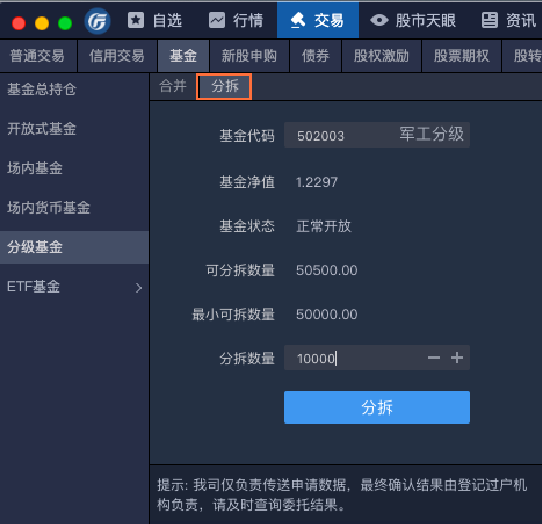 点击菜单【交易】-【基金】-【分级基金】,选择【分拆】标签。填写基金代码、分拆数量,点击【分拆】按钮。在弹出的委托确认窗口进行确认,委托结果通过【今日委托】列表查看。