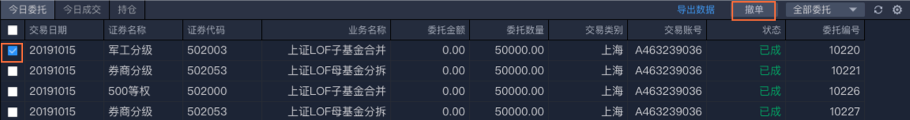 【交易】-【基金】-【分级基金】底部列表【今日委托】,通过勾选框单选或多选需要撤单委托,点击【撤单】按钮。在弹出的提示窗口进行确认,撤单结果通过委托记录查看。