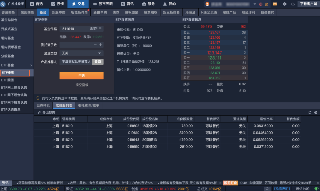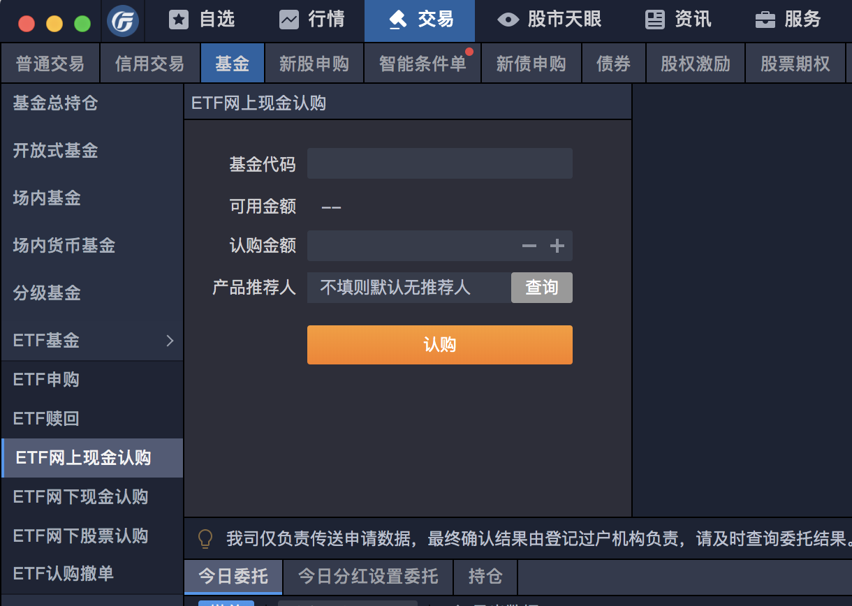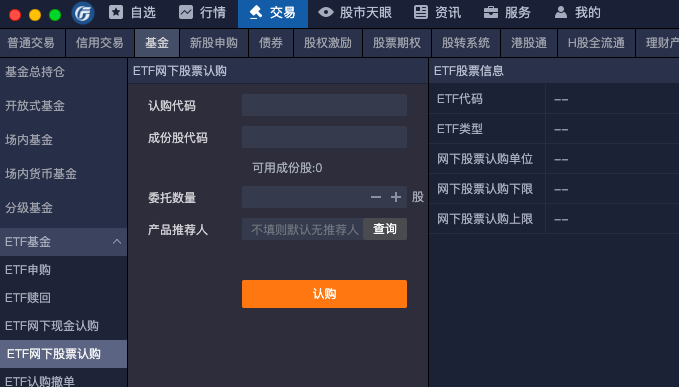 点击菜单【交易】-【基金】-【ETF基金】-【ETF申购】,操作流程如下: