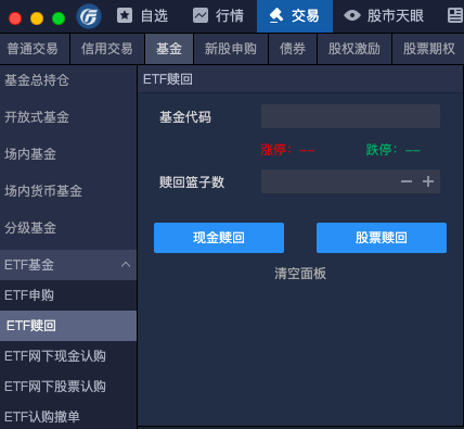 点击菜单【交易】-【基金】-【ETF基金】-【ETF赎回】,操作流程如下: