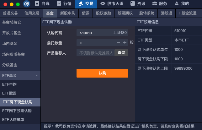 点击菜单【交易】-【基金】-【ETF基金】-【ETF网上现金认购】,操作流程如下: