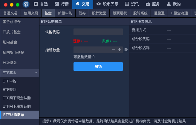 点击【交易】-【基金】-【ETF基金】-【ETF认购撤单】,填写认购代码、撤销数量,点击【撤销】按钮。在弹出的提示窗口进行确认,撤单结果通过委托记录查看。