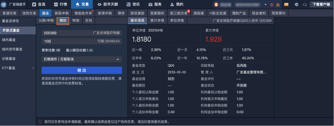 点击菜单【交易】-【基金】-【开放式基金】,切换到【赎回】标签。操作流程如下: