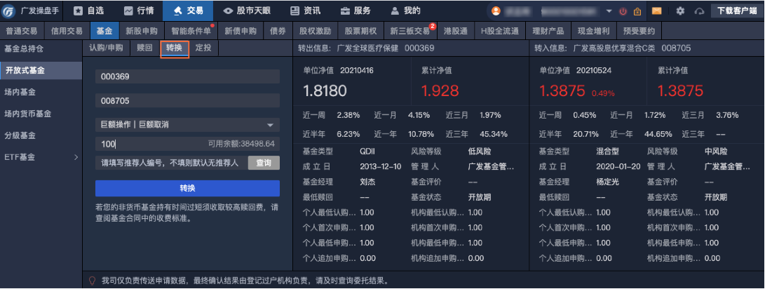点击【交易】-【基金】-【开放式基金】,切换到【转换】标签。操作流程如下: